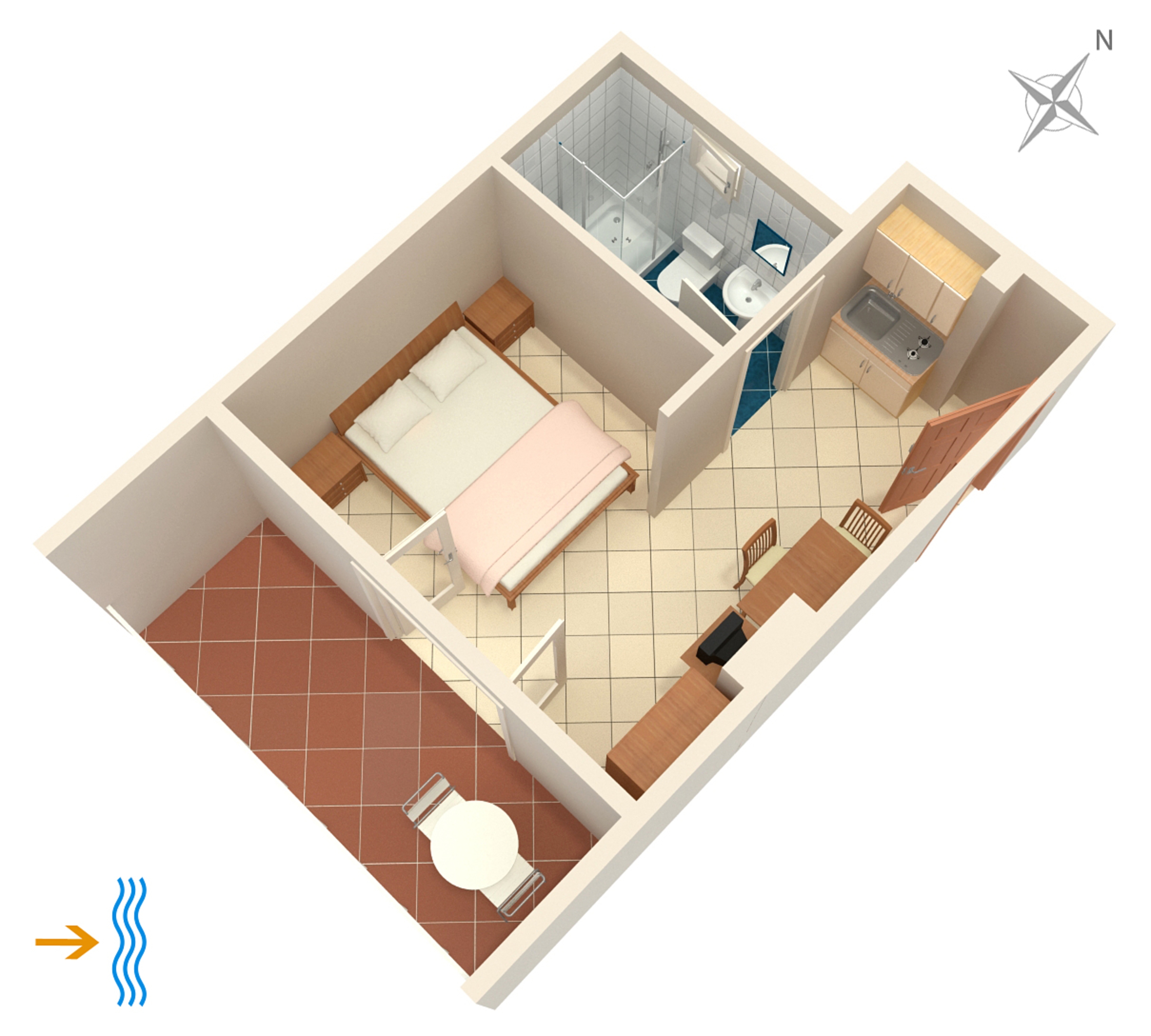 Studio flat can accommodate 2 guests. Beds are situated in 1 sleeping rooms, within 17m2. Guests can use a private terrace to enjoy the warm summer evenings. The studio offers the sea view. Food can be prepared using barbecue which is shared with other guests too. INCLUDED IN THE PRICE: tourist tax, final cleaning, air-conditioning, parking, internet, iron, ironing board, hairdryer. OBLIGATORY ADDITIONAL COSTS: short stay fee (surcharge depending on a number of booked nights: 30% - 1, 20% - 2, 10% - 3). The availability of additional services for your chosen dates of stay, as well as their prices (if none are listed) must be checked ahead of time. Any additional services not shown in the price calculation are payable directly to the property owner and only if used by the visitor. Discounts to the base price: free day 14=13 (for reservations of 14 or more days you get one free day for the stay until 31122026).