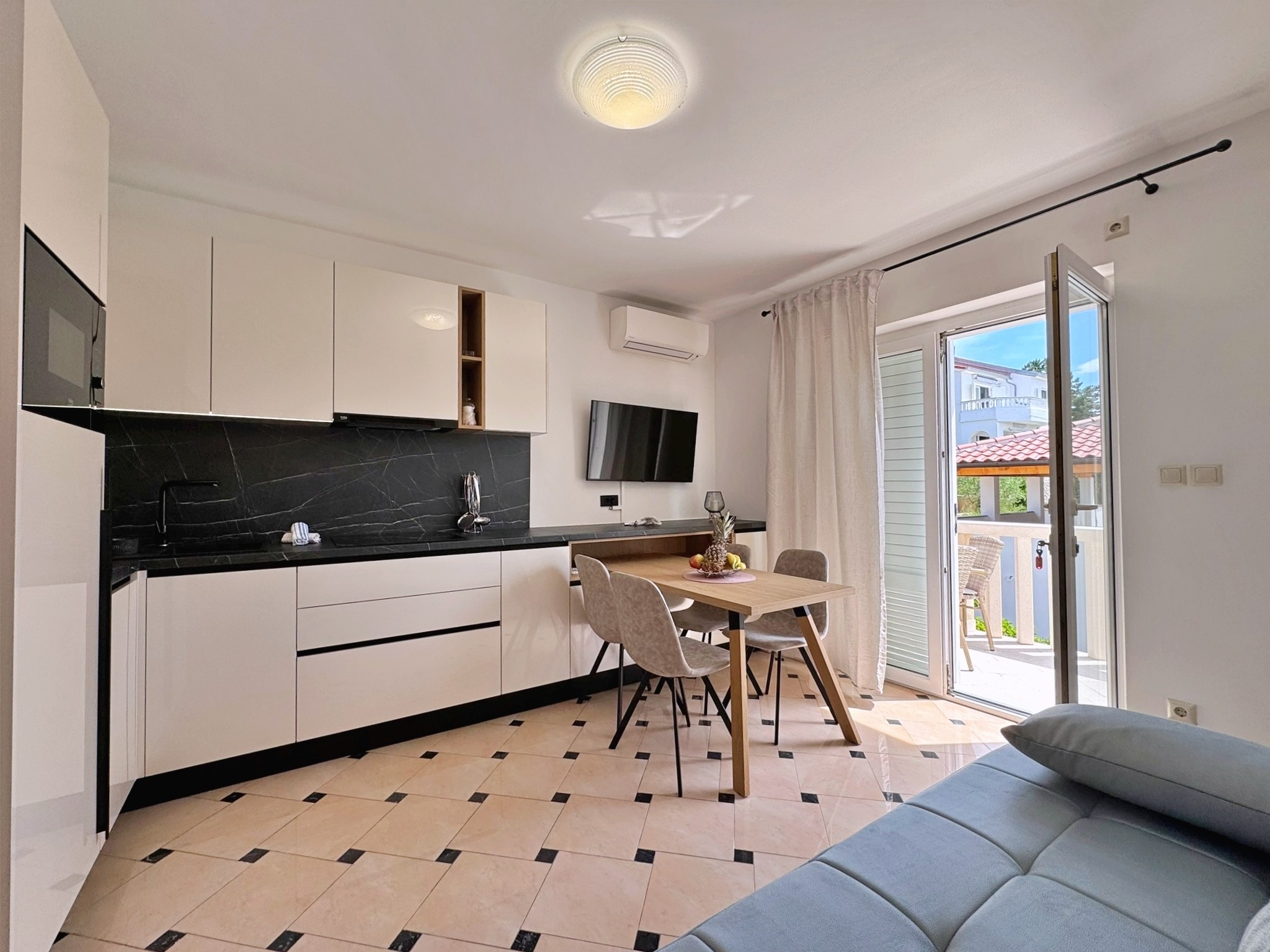 Apartment can accommodate 4 guests. Beds are situated in 1 sleeping rooms, but also in the dining room, within 45m2. Guests can use a private balcony to enjoy the warm summer evenings. The apartment offers the sea view. Food can be prepared using barbecue which is shared with other guests too. INCLUDED IN THE PRICE: tourist tax, final cleaning, air-conditioning, parking, internet, hairdryer. The availability of additional services for your chosen dates of stay, as well as their prices (if none are listed) must be checked ahead of time. Any additional services not shown in the price calculation are payable directly to the property owner and only if used by the visitor.