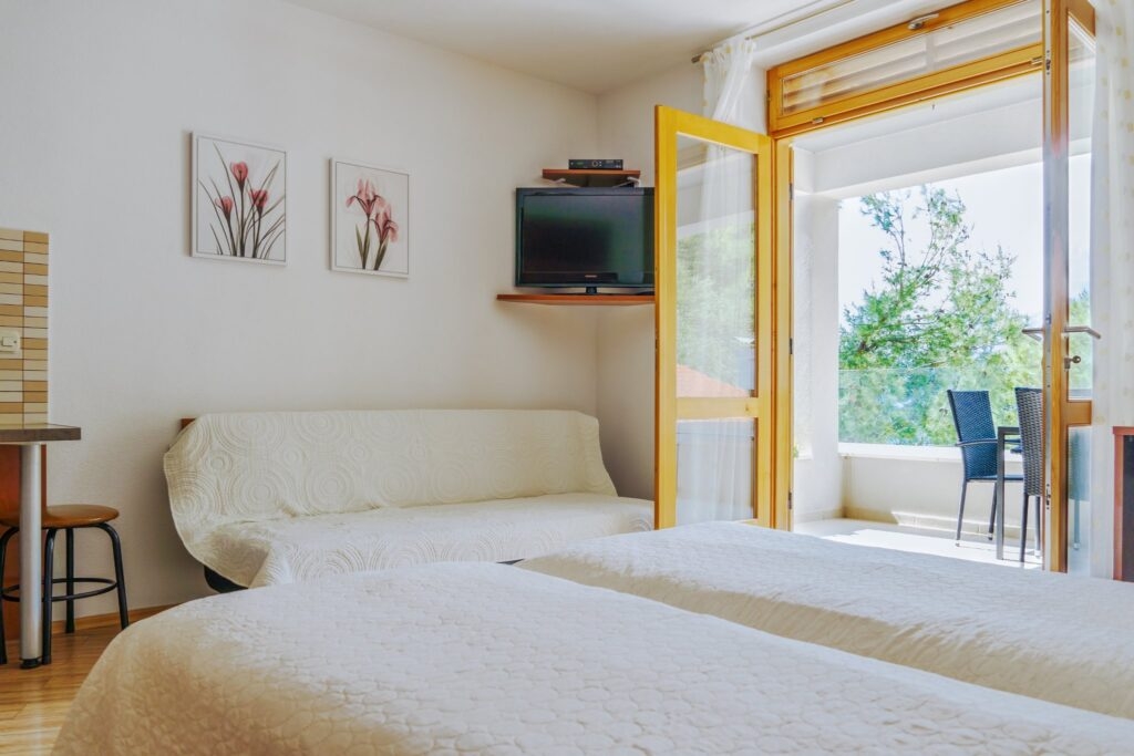 Studio flat can accommodate 3 guests. Beds are situated in 1 sleeping rooms, within 33m2. Guests can use a private terrace to enjoy the warm summer evenings. The studio offers the sea view. Food can be prepared using barbecue which is shared with other guests too. INCLUDED IN THE PRICE: tourist tax, final cleaning, air-conditioning, parking, internet, iron, ironing board, hairdryer. OPTIONAL ADDITIONAL COSTS: additional bed (€22.50 per night). The availability of additional services for your chosen dates of stay, as well as their prices (if none are listed) must be checked ahead of time. Any additional services not shown in the price calculation are payable directly to the property owner and only if used by the visitor.