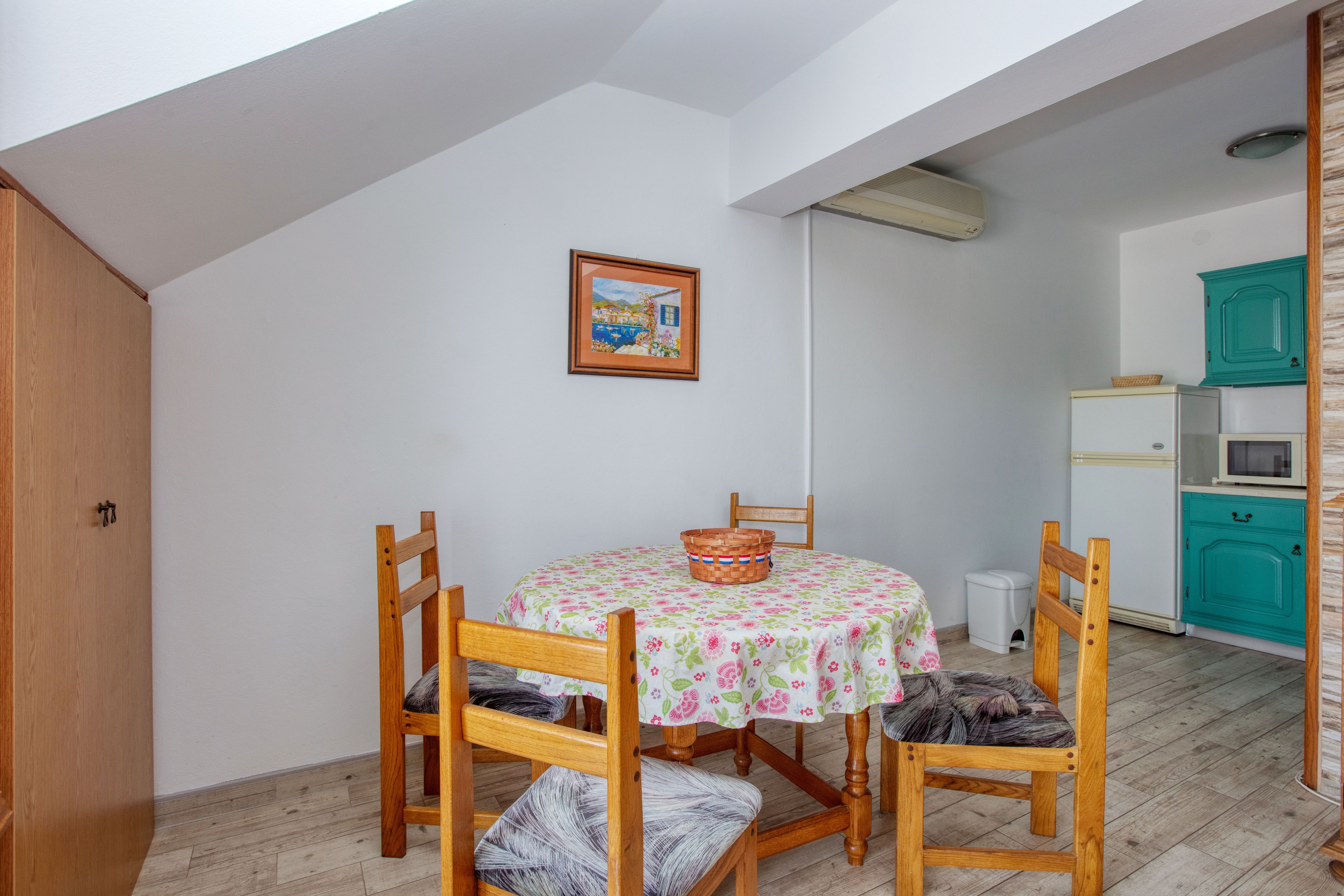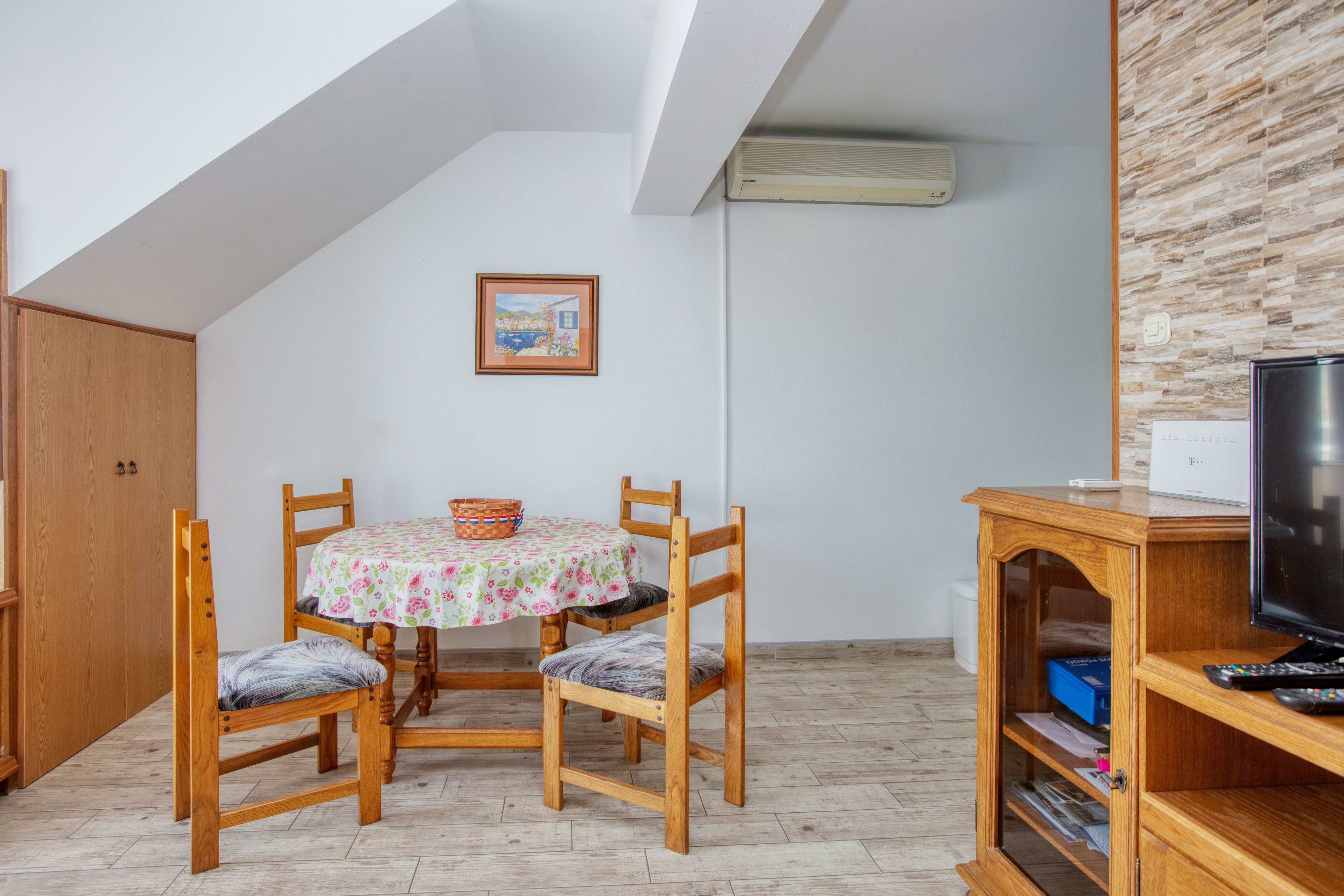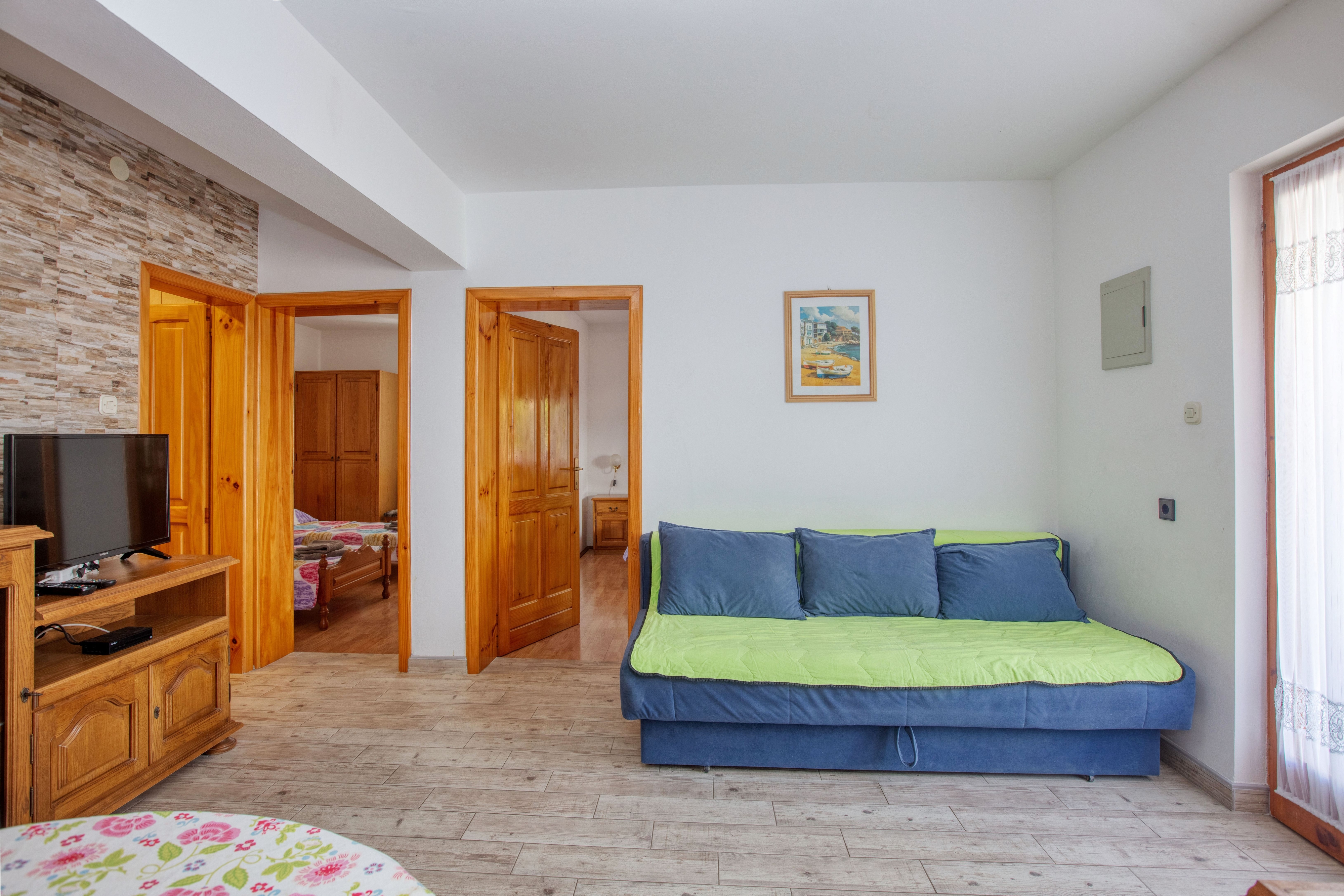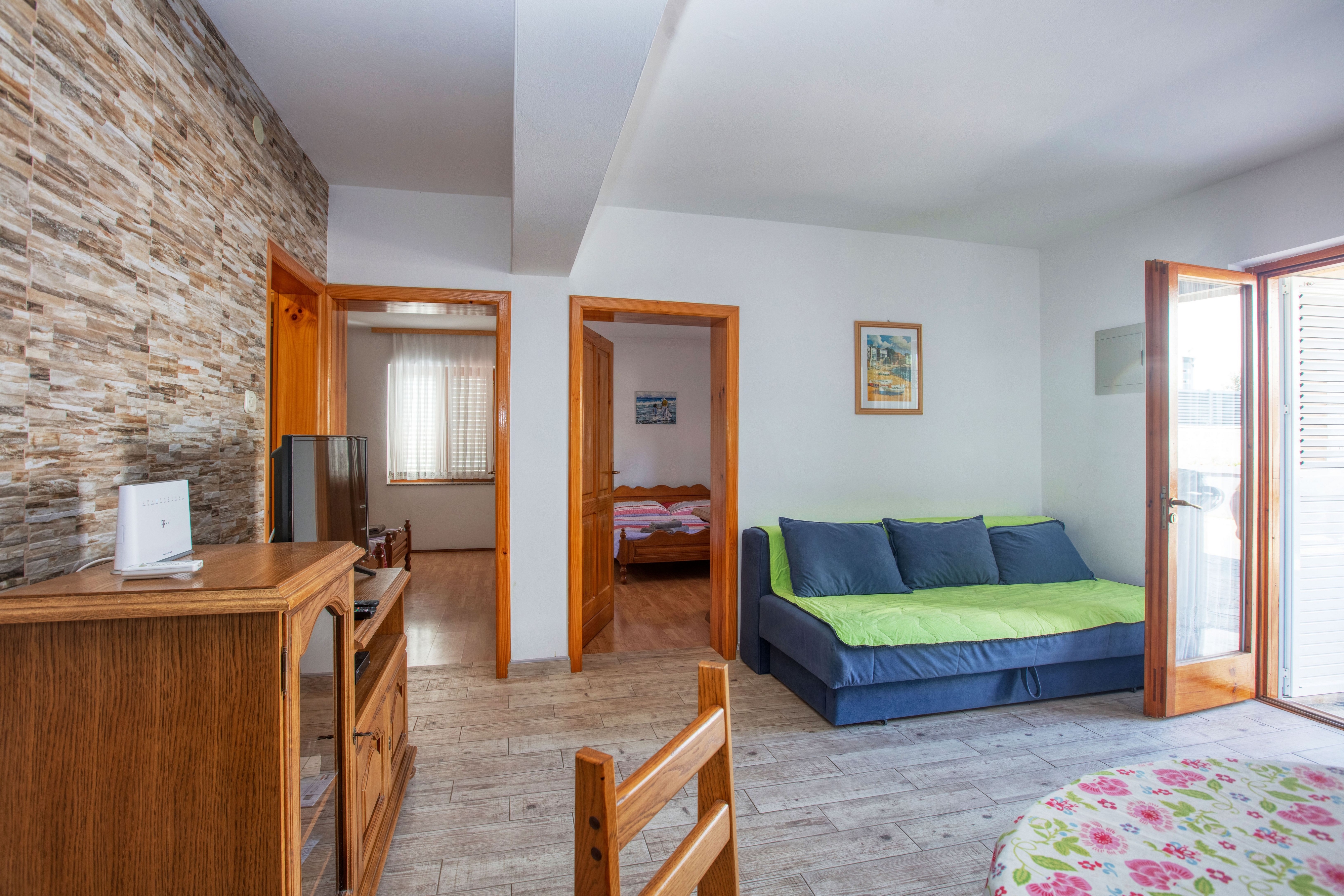 Apartment can accommodate 5 guests. Beds are situated in 2 sleeping rooms, but also in the living room, within 51m2. Guests can use a private terrace to enjoy the warm summer evenings. Food can be prepared using barbecue which is shared with other guests too. This accommodation unit welcomes pets at an additional charge. INCLUDED IN THE PRICE: tourist tax, final cleaning, air-conditioning, parking, internet. OBLIGATORY ADDITIONAL COSTS: short stay fee (surcharge depending on a number of booked nights: 30% - 1, 20% - 2, 10% - 3). OPTIONAL ADDITIONAL COSTS: pets (€10.00 per night). The availability of additional services for your chosen dates of stay, as well as their prices (if none are listed) must be checked ahead of time. Any additional services not shown in the price calculation are payable directly to the property owner and only if used by the visitor.