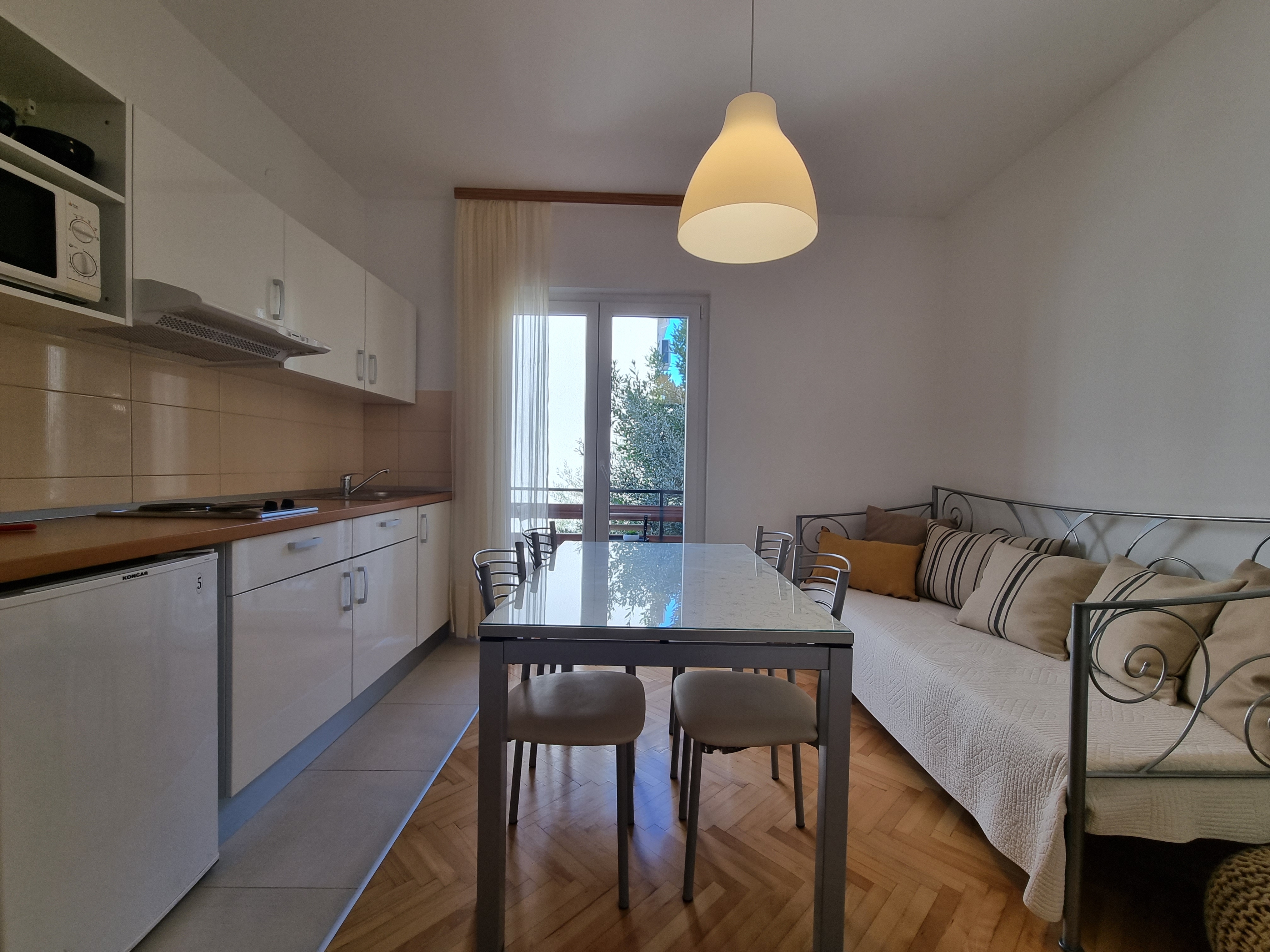 Apartment can accommodate 4 guests. Beds are situated in 1 sleeping rooms, but also in the dining room, within 28m2. Guests can use a private balcony to enjoy the warm summer evenings. The apartment offers the sea view. Food can be prepared using barbecue which is shared with other guests too. INCLUDED IN THE PRICE: tourist tax, final cleaning, air-conditioning, parking, internet. OBLIGATORY ADDITIONAL COSTS: short stay fee (surcharge depending on a number of booked nights: 30% - 1, 20% - 2, 10% - 3). The availability of additional services for your chosen dates of stay, as well as their prices (if none are listed) must be checked ahead of time. Any additional services not shown in the price calculation are payable directly to the property owner and only if used by the visitor.