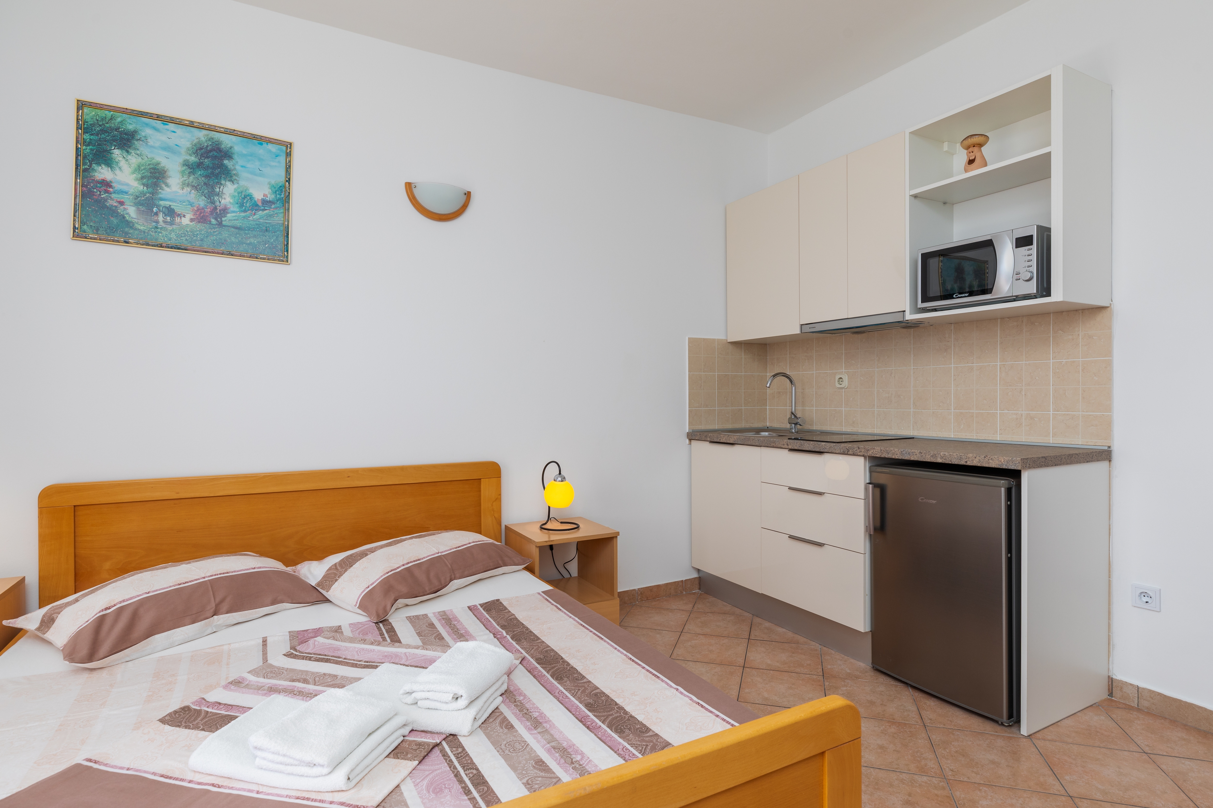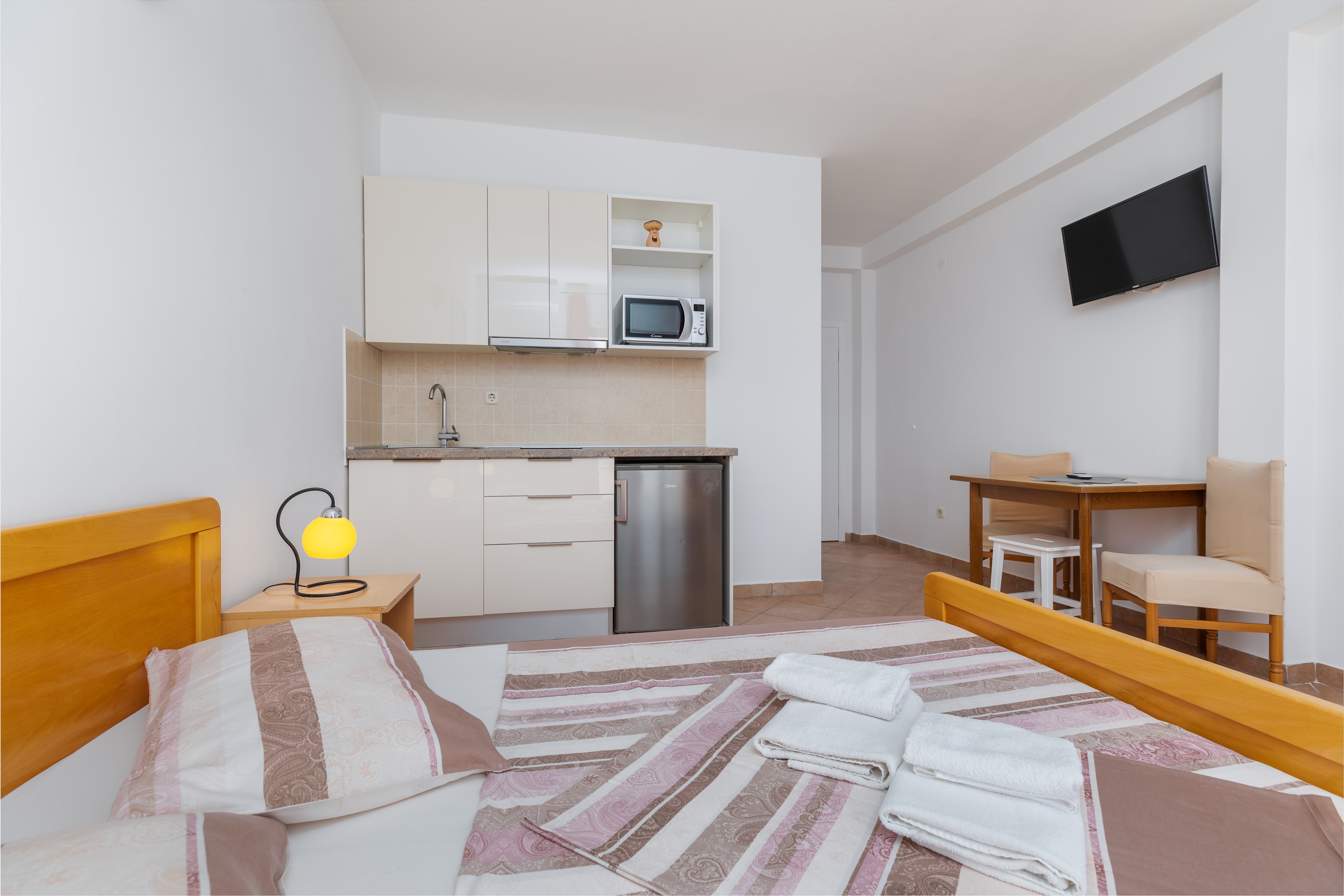 Studio flat can accommodate 2 guests. Beds are situated in 1 sleeping rooms, within 24m2. Guests can use a private balcony to enjoy the warm summer evenings. The studio offers the sea view. Food can be prepared using barbecue which is shared with other guests too. This accommodation unit welcomes pets at an additional charge. INCLUDED IN THE PRICE: tourist tax, final cleaning, air-conditioning, parking, internet, laundry, boat mooring, baby cot, iron, ironing board, portable barbecue. OPTIONAL ADDITIONAL COSTS: pets (€15.00 per night). The availability of additional services for your chosen dates of stay, as well as their prices (if none are listed) must be checked ahead of time. Any additional services not shown in the price calculation are payable directly to the property owner and only if used by the visitor. Discounts to the base price: free day 21=19 (for reservations of 21 or more days you get 2 free days for the stay until 31122026).