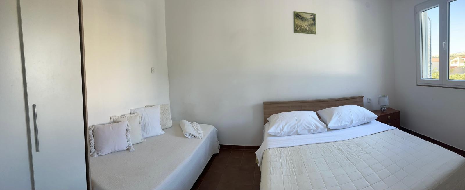 Apartment can accommodate 3 guests. Beds are situated in 1 sleeping rooms, within 27m2. Guests can use a private terrace to enjoy the warm summer evenings. Food can be prepared using barbecue which is shared with other guests too. INCLUDED IN THE PRICE: tourist tax, final cleaning, parking, internet, iron, ironing board, hairdryer. OBLIGATORY ADDITIONAL COSTS: short stay fee (surcharge depending on a number of booked nights: 30% - 1, 20% - 2, 10% - 3). OPTIONAL ADDITIONAL COSTS: air-conditioning (€10.00 per night), laundry (€10.00 washing). The availability of additional services for your chosen dates of stay, as well as their prices (if none are listed) must be checked ahead of time. Any additional services not shown in the price calculation are payable directly to the property owner and only if used by the visitor.