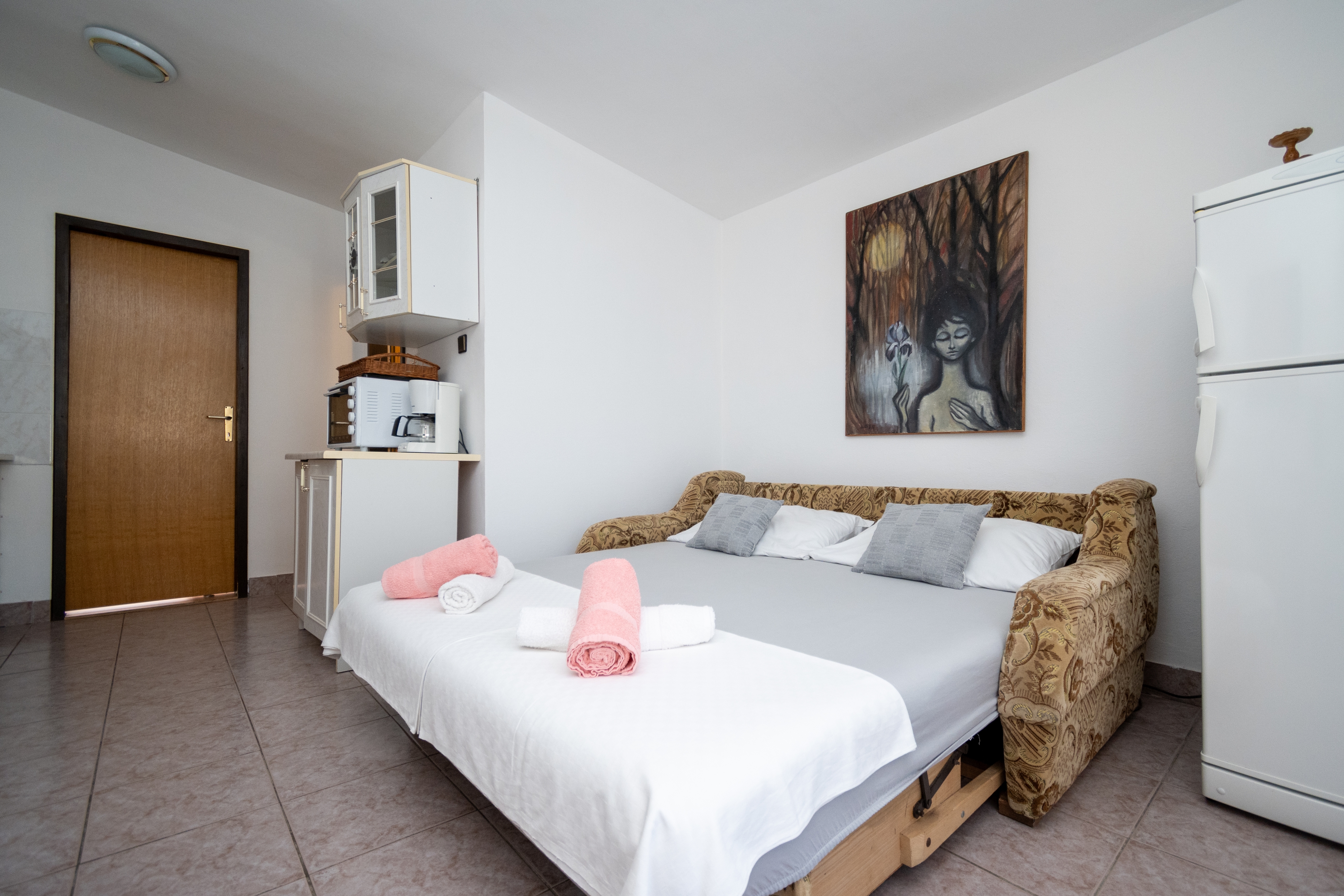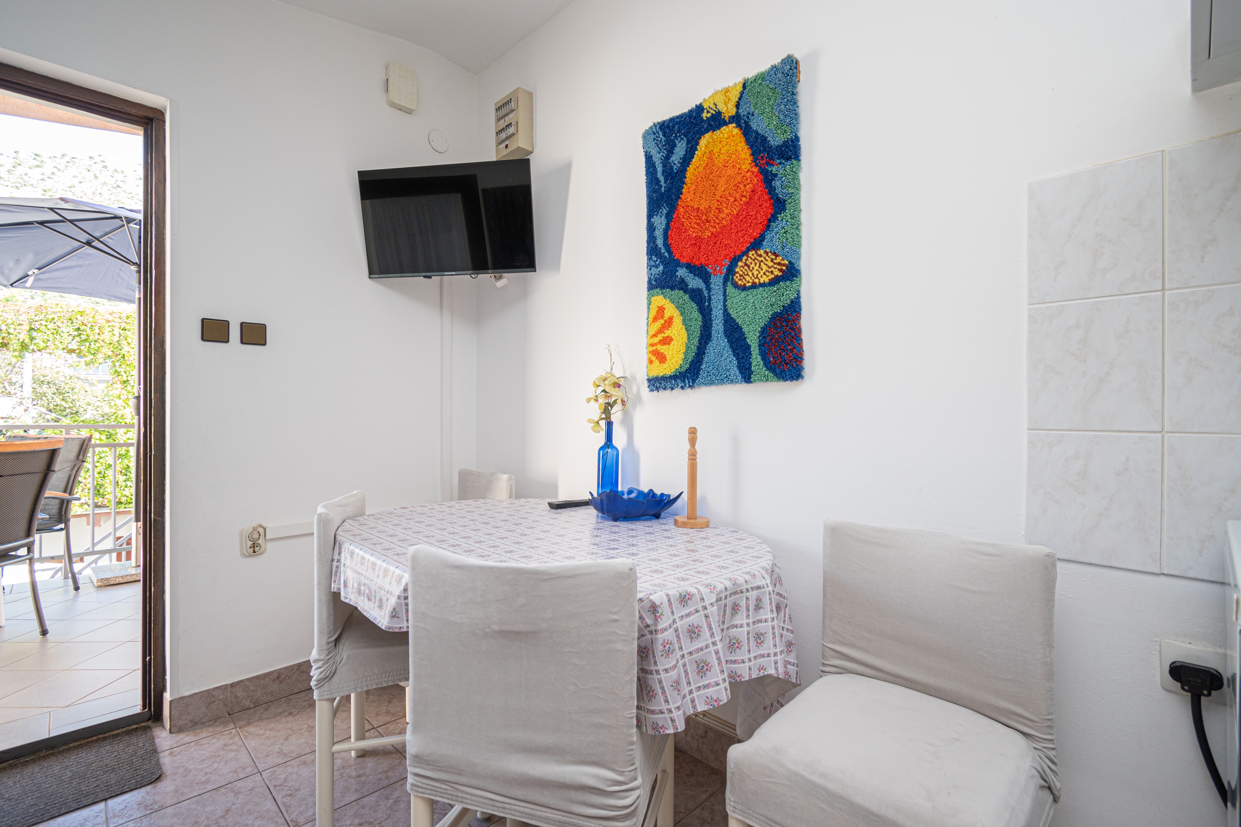 Apartment can accommodate 4 guests. Beds are situated in 1 sleeping rooms, but also in the living room, within 35m2. Guests can use a private terrace to enjoy the warm summer evenings. Food can be prepared using barbecue which is shared with other guests too. INCLUDED IN THE PRICE: tourist tax, final cleaning, air-conditioning, parking, internet, iron, ironing board, hairdryer. OPTIONAL ADDITIONAL COSTS: laundry (€5.00 washing). The availability of additional services for your chosen dates of stay, as well as their prices (if none are listed) must be checked ahead of time. Any additional services not shown in the price calculation are payable directly to the property owner and only if used by the visitor. Discounts to the base price: free day 14=13 (for reservations of 14 or more days you get one free day for the stay until 31122026).