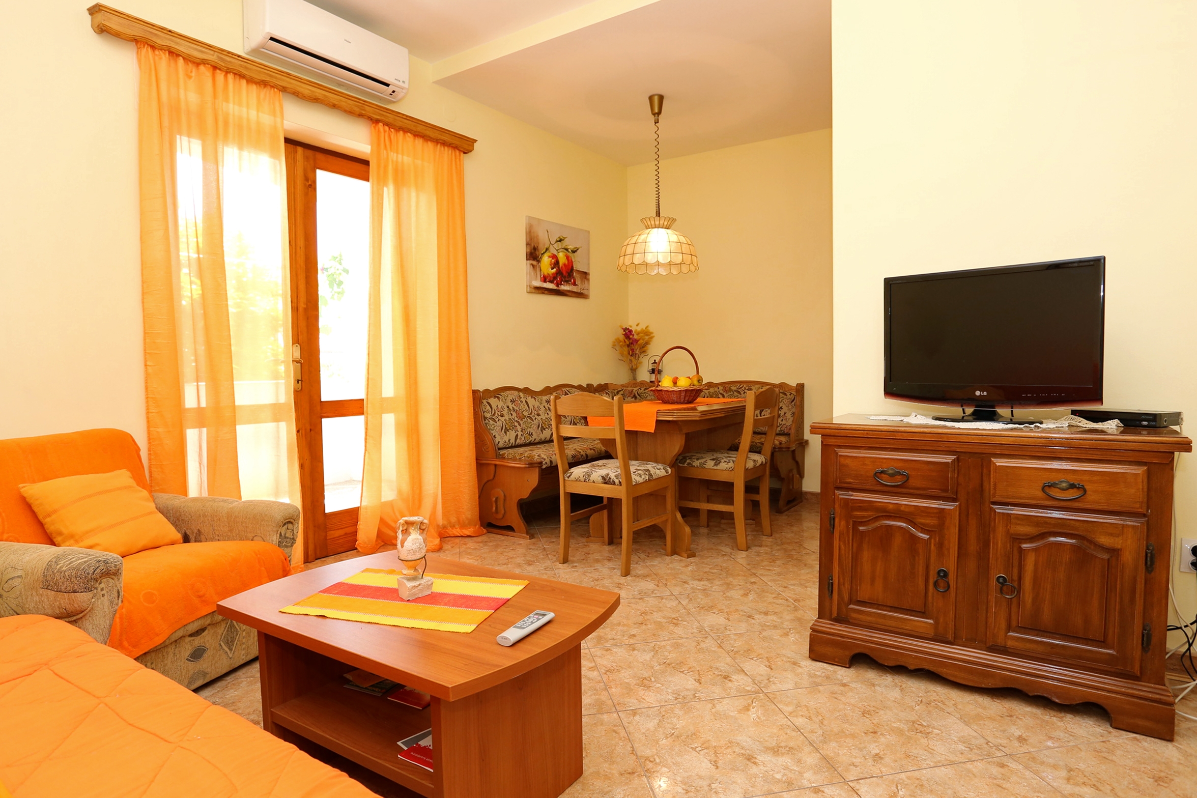 Apartment can accommodate 5 guests. Beds are situated in 1 sleeping rooms, but also in the living room, within 44m2. Guests can use a private terrace to enjoy the warm summer evenings. Food can be prepared using barbecue which is shared with other guests too. INCLUDED IN THE PRICE: tourist tax, final cleaning, air-conditioning, parking, garage, internet, laundry, baby cot, hairdryer. OBLIGATORY ADDITIONAL COSTS: short stay fee (surcharge depending on a number of booked nights: 30% - 1, 20% - 2, 10% - 3). The availability of additional services for your chosen dates of stay, as well as their prices (if none are listed) must be checked ahead of time. Any additional services not shown in the price calculation are payable directly to the property owner and only if used by the visitor. Discounts to the base price: free day 21=19 (for reservations of 21 or more days you get 2 free days for the stay until 31122026).