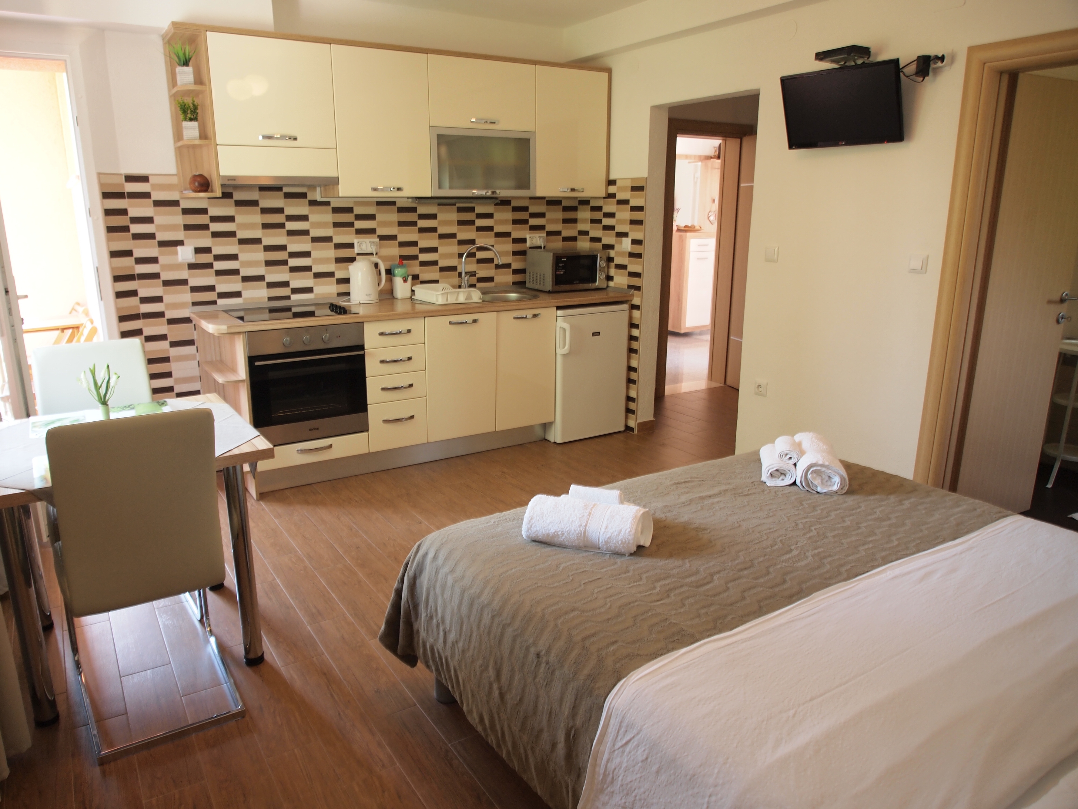 Studio flat can accommodate 2 guests. Beds are situated in 1 sleeping rooms, within 24m2. Guests can use a private balcony to enjoy the warm summer evenings. Food can be prepared using barbecue which is shared with other guests too. For the booked accommodation unit the deposit is paid directly to the owner upon check-in (deposit amount is displayed on the website) INCLUDED IN THE PRICE: tourist tax, final cleaning, air-conditioning, parking, internet, hairdryer. OBLIGATORY ADDITIONAL COSTS: deposit (€150.00 one-time payment). The availability of additional services for your chosen dates of stay, as well as their prices (if none are listed) must be checked ahead of time. Any additional services not shown in the price calculation are payable directly to the property owner and only if used by the visitor.