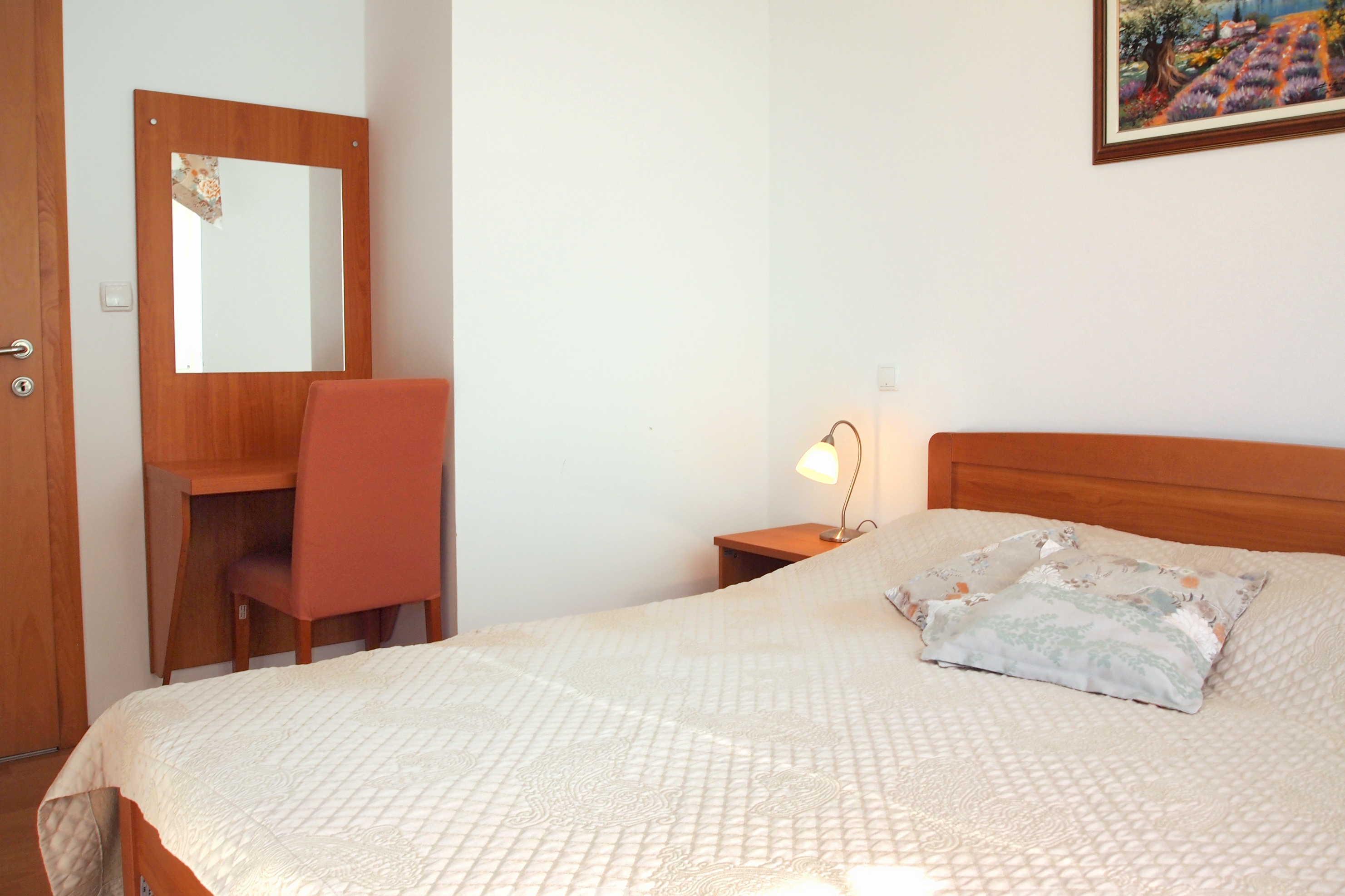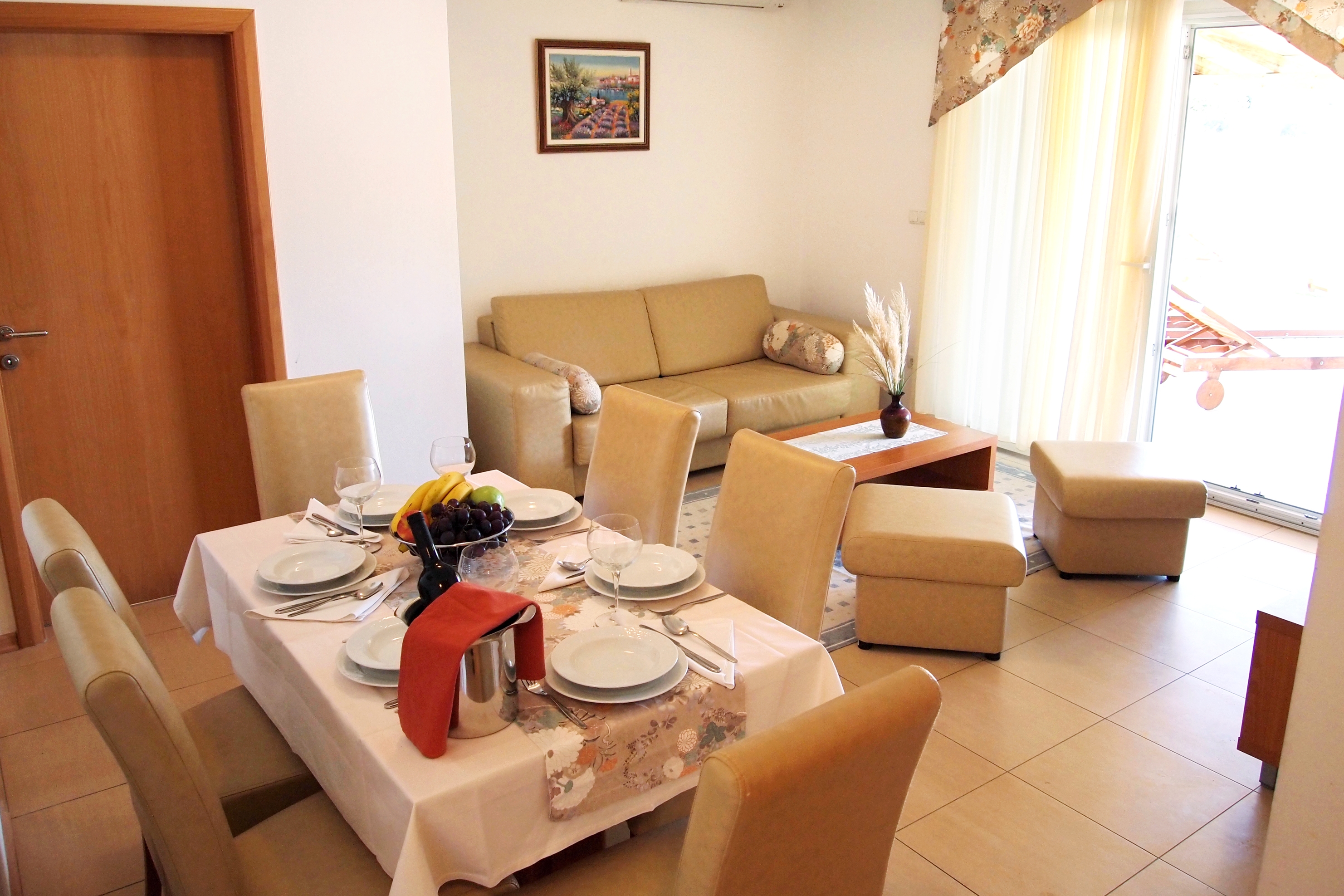 Apartment can accommodate 6 guests. Beds are situated in 2 sleeping rooms, but also in the living room, within 46m2. Guests can use a private terrace to enjoy the warm summer evenings. The apartment offers the sea view. Food can be prepared using barbecue which is shared with other guests too. Shared pool is on disposal during stay. For the booked accommodation unit the deposit is paid directly to the owner upon check-in (deposit amount is displayed on the website) INCLUDED IN THE PRICE: final cleaning, air-conditioning, pool, parking, internet, hairdryer. OBLIGATORY ADDITIONAL COSTS: tourist tax (adults €0.93 - €1.90 nightperson, discount for children aged 12 - 17), deposit (€100.00 one-time payment). The availability of additional services for your chosen dates of stay, as well as their prices (if none are listed) must be checked ahead of time. Any additional services not shown in the price calculation are payable directly to the property owner and only if used by the visitor.