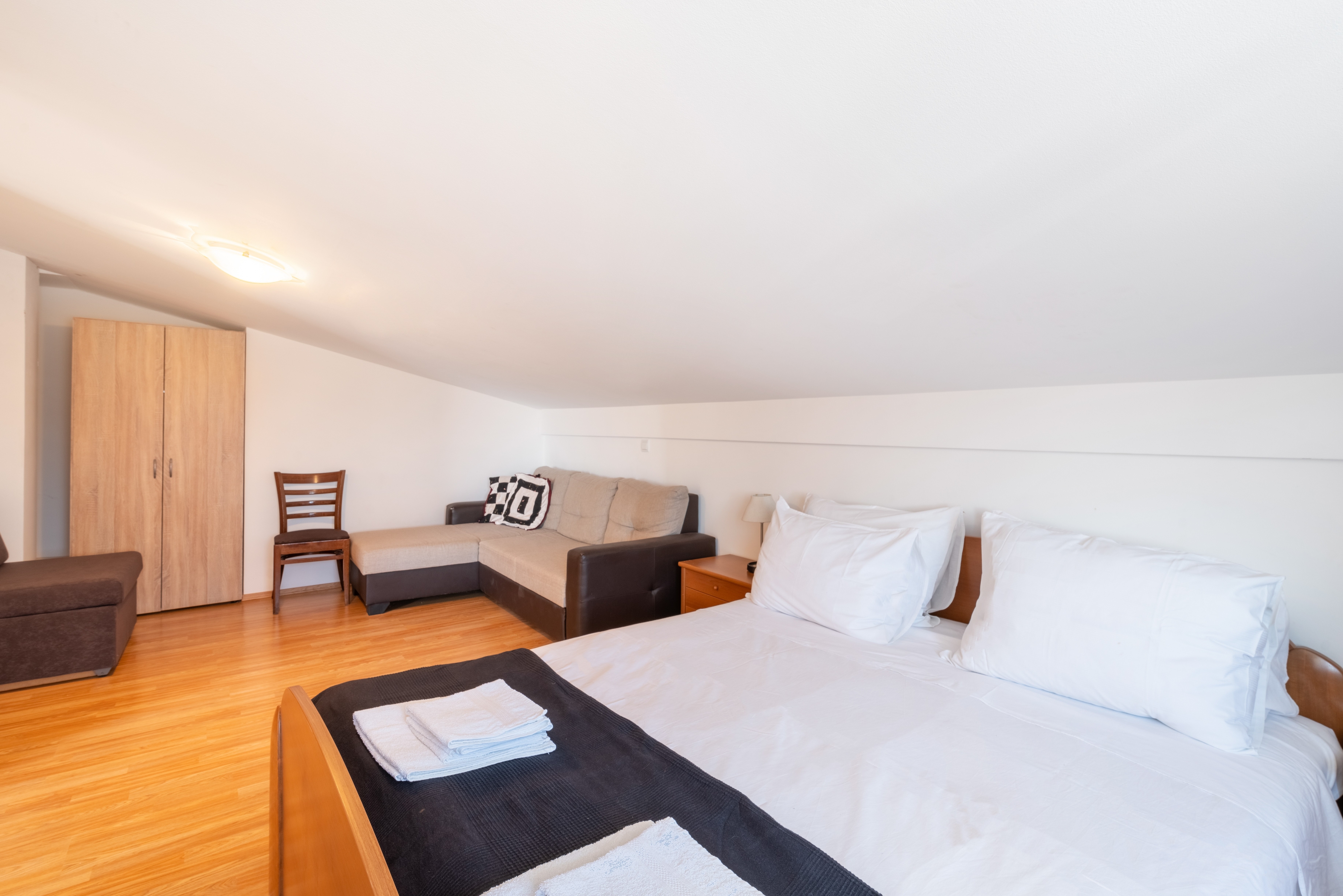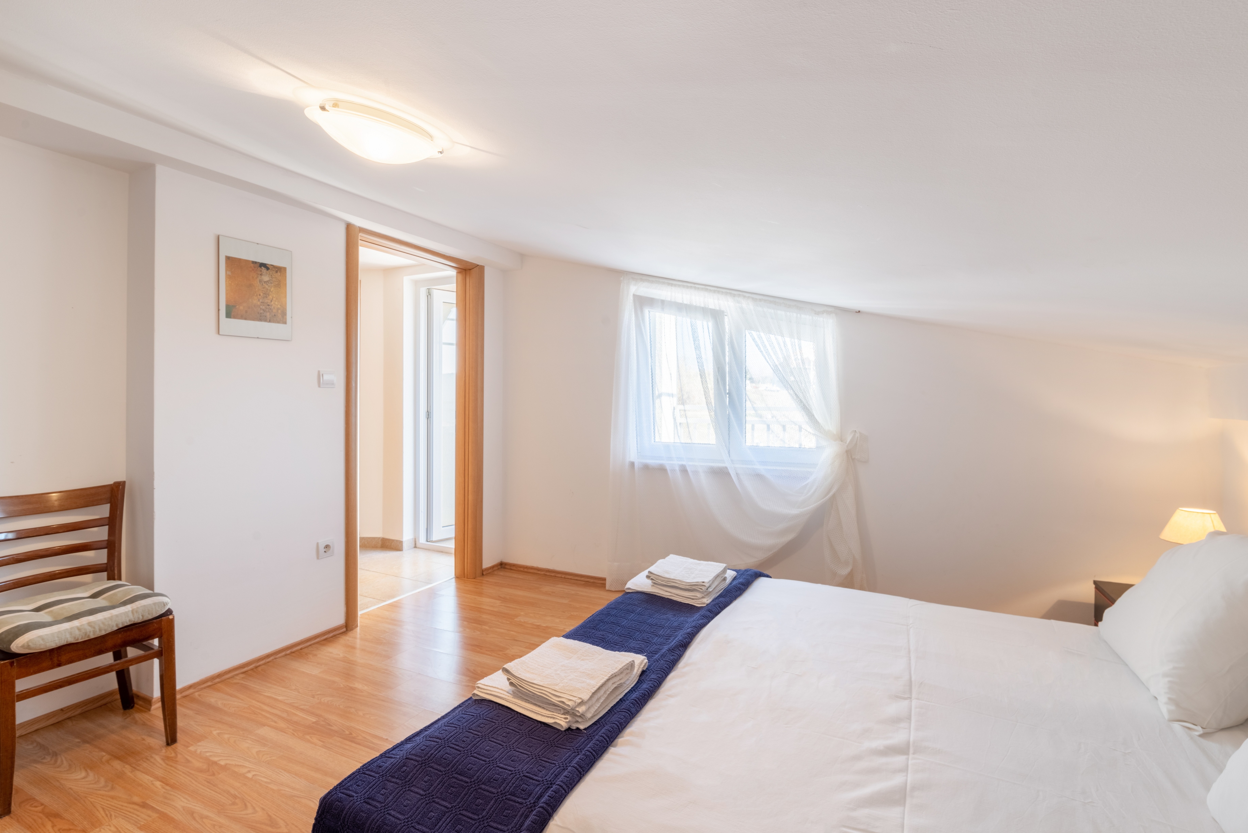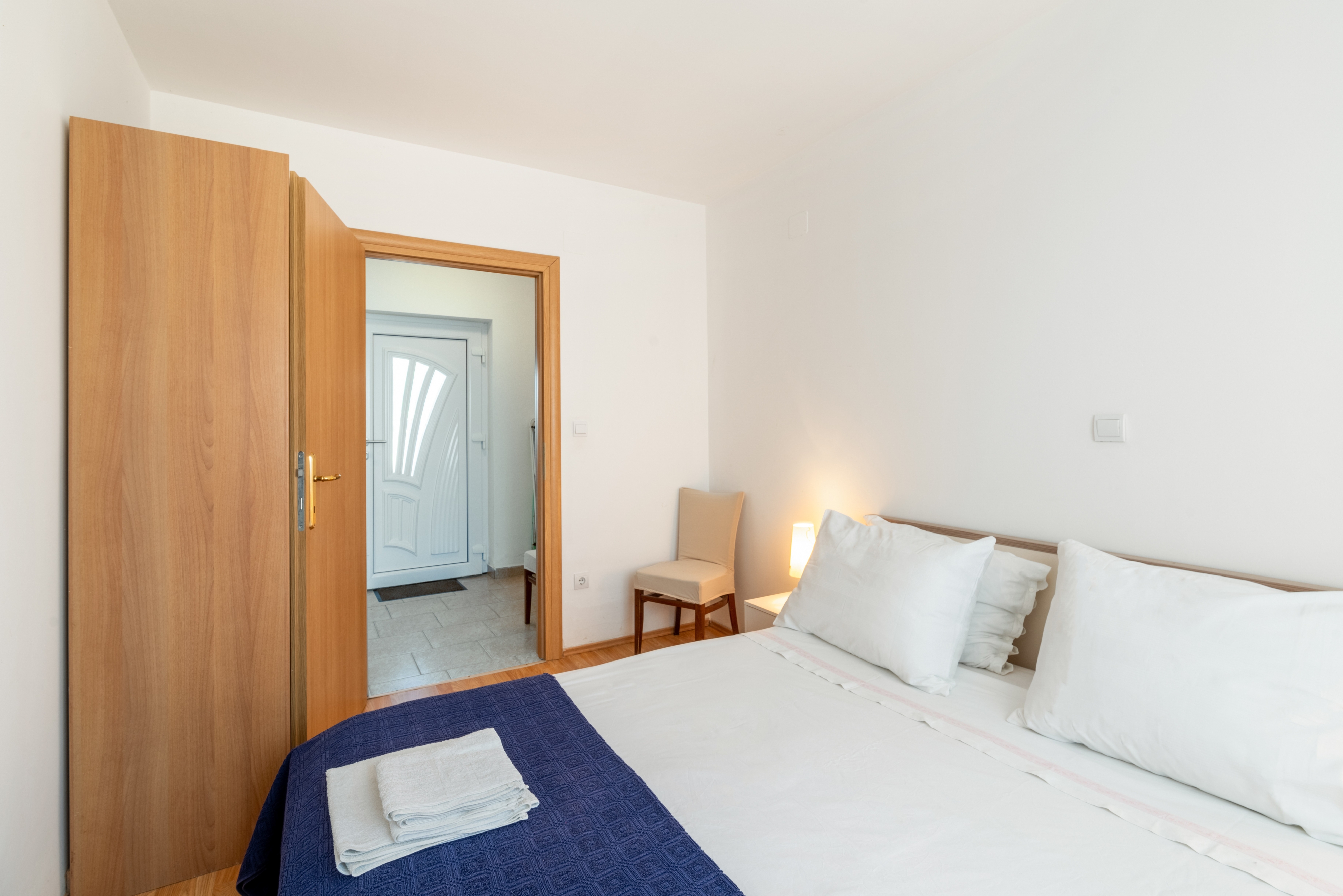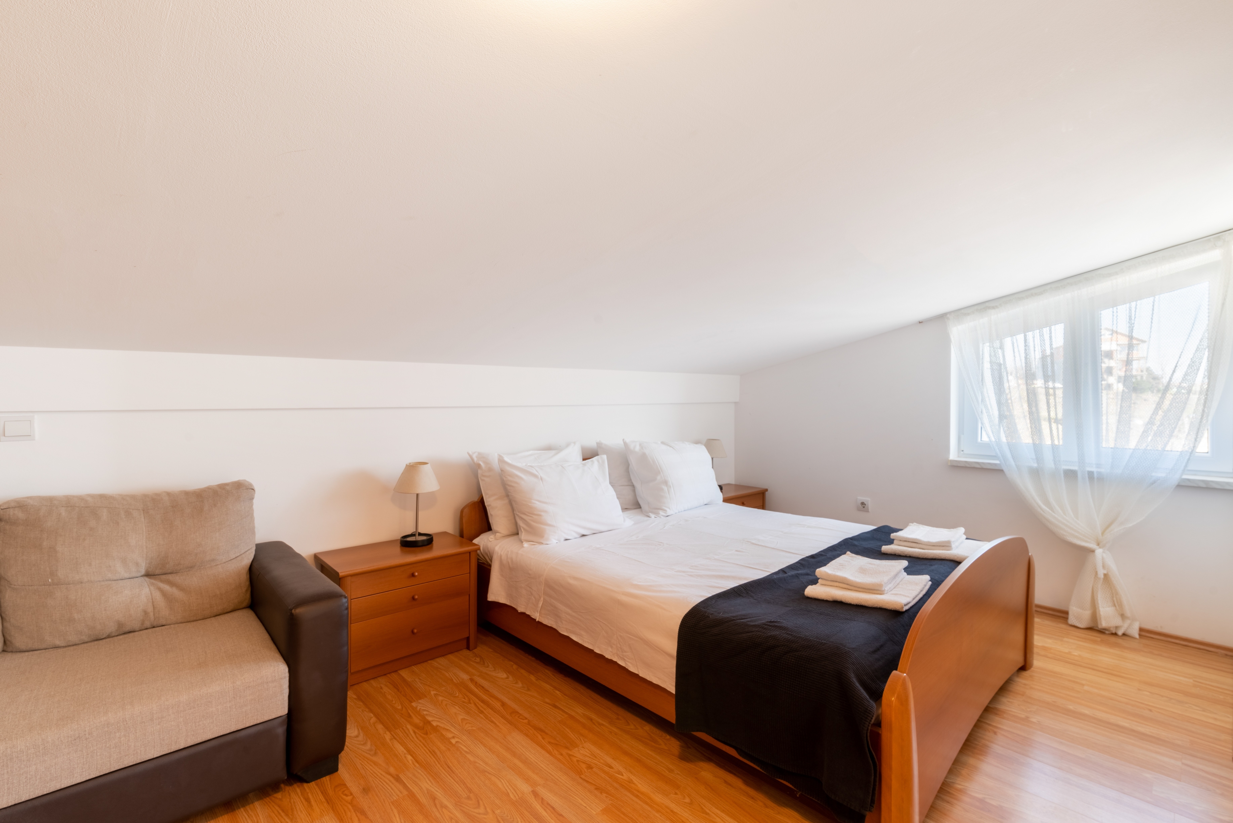 Apartment can accommodate 6 guests. Beds are situated in 3 sleeping rooms, within 74m2. Guests can use a private balcony to enjoy the warm summer evenings. The apartment offers the sea view. Food can be prepared using barbecue which is shared with other guests too. This accommodation unit welcomes pets at an additional charge. Reserved accommodation unit has a shared terrace. INCLUDED IN THE PRICE: tourist tax, final cleaning, air-conditioning, parking, internet, iron, ironing board, hairdryer. OBLIGATORY ADDITIONAL COSTS: short stay fee (surcharge depending on a number of booked nights: 30% - 1, 20% - 2, 10% - 3). OPTIONAL ADDITIONAL COSTS: pets (€20.00 per night), additional bed (€10.00 per night). The availability of additional services for your chosen dates of stay, as well as their prices (if none are listed) must be checked ahead of time. Any additional services not shown in the price calculation are payable directly to the property owner and only if used by the visitor. Discounts to the base price: free day 14=13 (for reservations of 14 or more days you get one free day for the stay until 31122026).