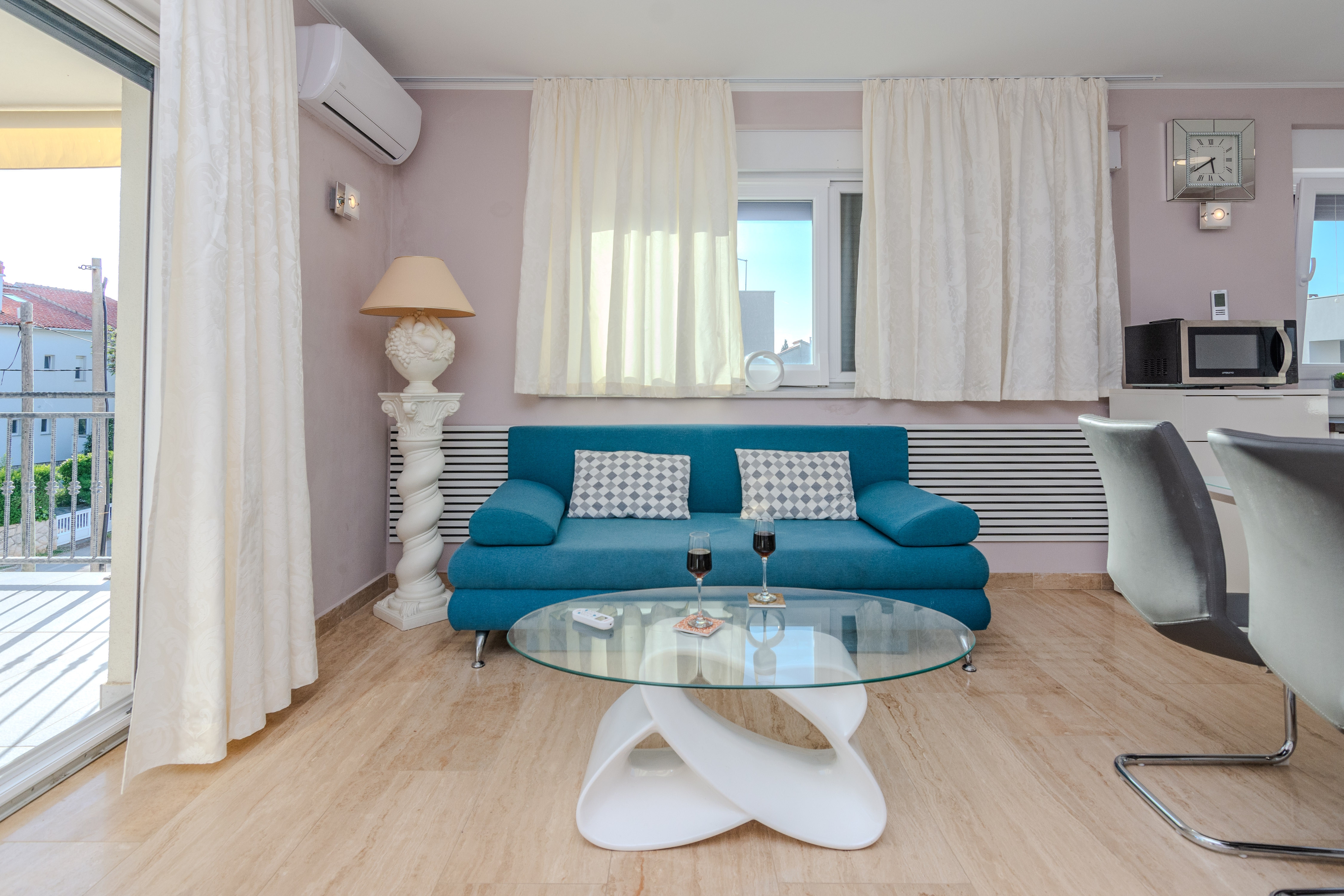 Apartment can accommodate 6 guests. Beds are situated in 2 sleeping rooms, but also in the living room, within 65m2. Guests can use a private terrace to enjoy the warm summer evenings. Food can be prepared using barbecue which is shared with other guests too. INCLUDED IN THE PRICE: tourist tax, final cleaning, air-conditioning, parking, internet, baby cot, iron, ironing board, hairdryer. OBLIGATORY ADDITIONAL COSTS: short stay fee (surcharge depending on a number of booked nights: 30% - 1, 20% - 2, 10% - 3). The availability of additional services for your chosen dates of stay, as well as their prices (if none are listed) must be checked ahead of time. Any additional services not shown in the price calculation are payable directly to the property owner and only if used by the visitor.
