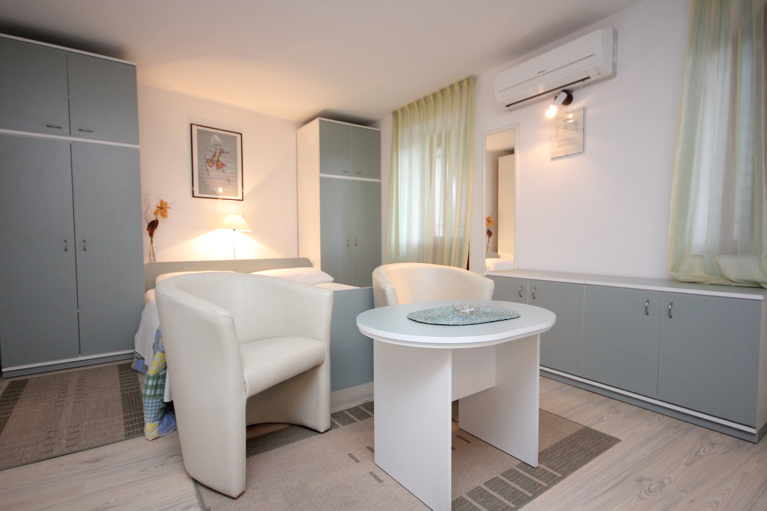 Studio flat can accommodate 2 guests. Beds are situated in 1 sleeping rooms, within 32m2. Guests can use a private terrace to enjoy the warm summer evenings. The studio offers the sea view. Food can be prepared using barbecue which is shared with other guests too. This accommodation unit welcomes pets at an additional charge. INCLUDED IN THE PRICE: tourist tax, final cleaning, air-conditioning, parking, internet, baby cot, iron, ironing board, hairdryer, 1 bed for children (included in the price). OBLIGATORY ADDITIONAL COSTS: short stay fee (surcharge depending on a number of booked nights: 30% - 1, 20% - 2, 10% - 3). OPTIONAL ADDITIONAL COSTS: pets (€5.00 per night). The availability of additional services for your chosen dates of stay, as well as their prices (if none are listed) must be checked ahead of time. Any additional services not shown in the price calculation are payable directly to the property owner and only if used by the visitor. Discounts to the base price: free day 14=13 (for reservations of 14 or more days you get one free day for the stay until 31122026).