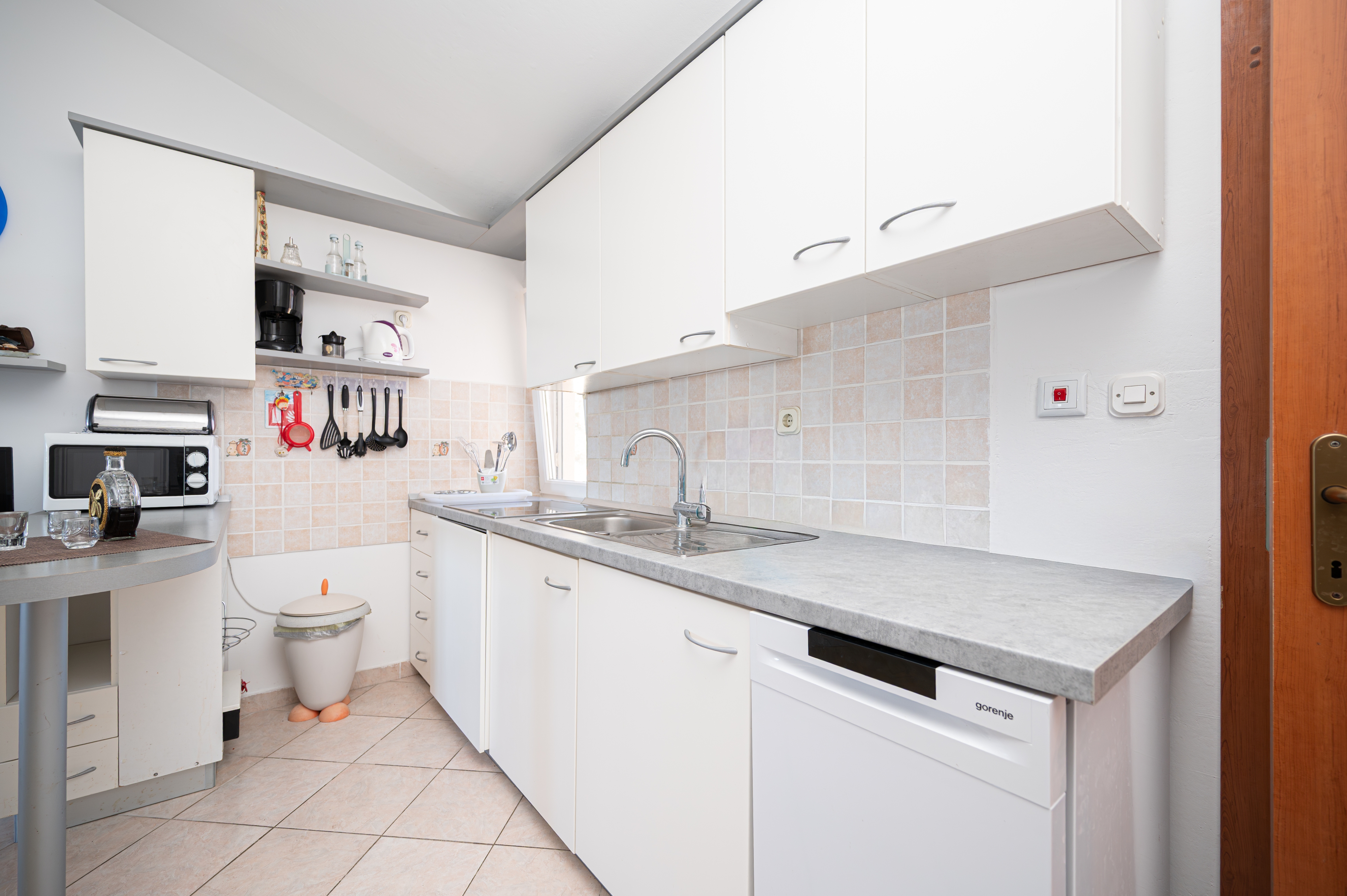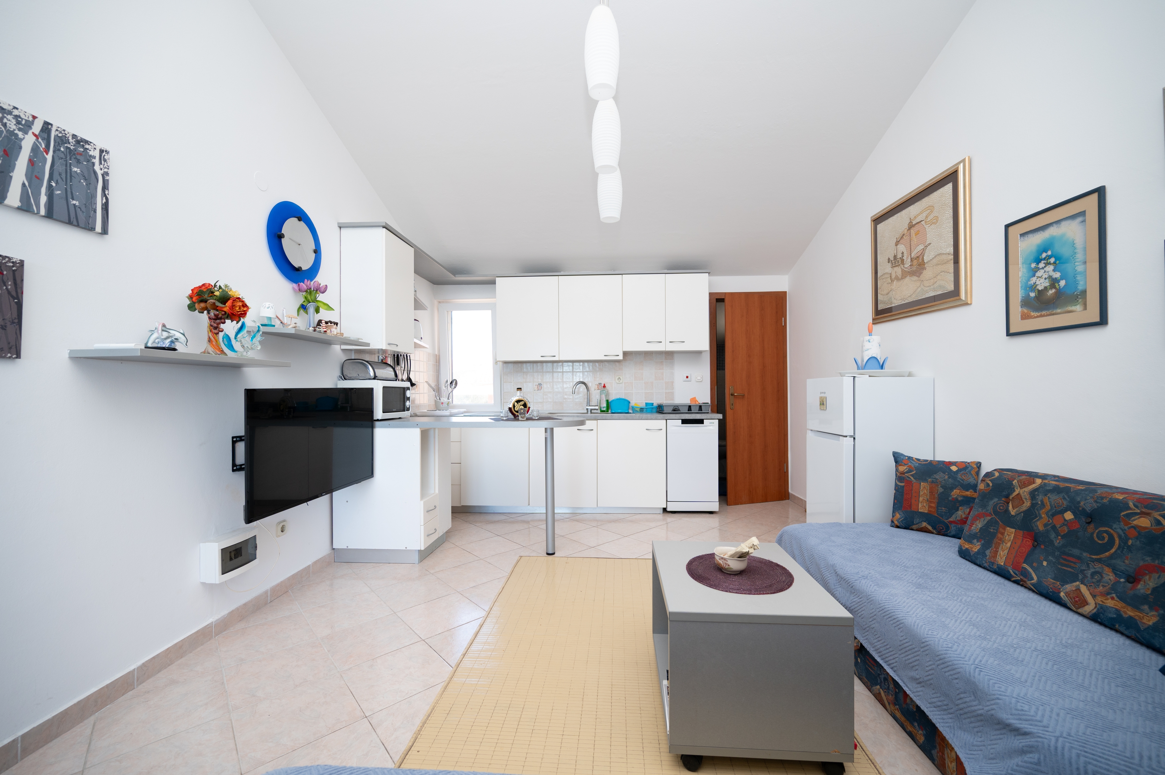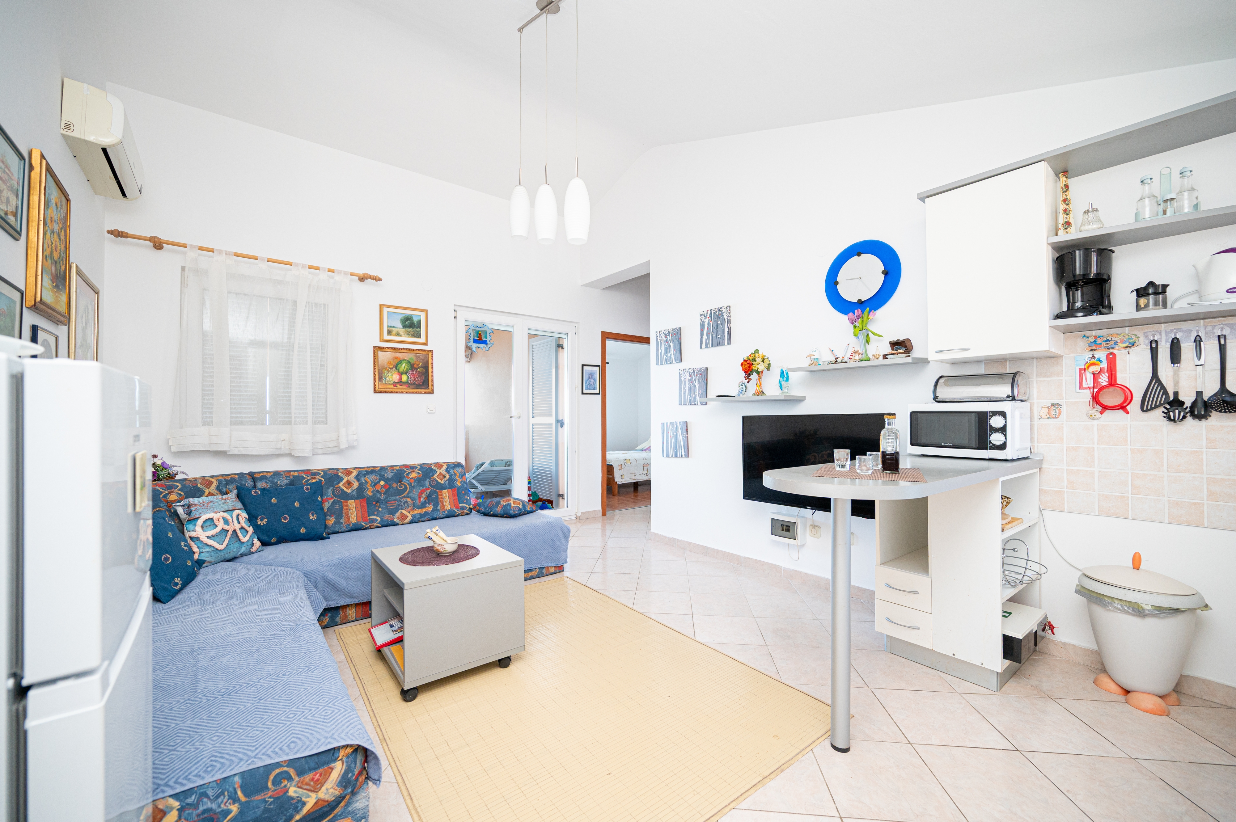 Apartment can accommodate 5 guests. Beds are situated in 2 sleeping rooms, but also in the living room, within 43m2. Guests can use a private terrace to enjoy the warm summer evenings. The apartment offers the sea view. Food can be prepared using barbecue which is shared with other guests too. INCLUDED IN THE PRICE: tourist tax, final cleaning, parking, internet, baby cot, iron, ironing board, hairdryer, sunshade, sunchairs. OPTIONAL ADDITIONAL COSTS: air-conditioning (€6.00 per night). The availability of additional services for your chosen dates of stay, as well as their prices (if none are listed) must be checked ahead of time. Any additional services not shown in the price calculation are payable directly to the property owner and only if used by the visitor.