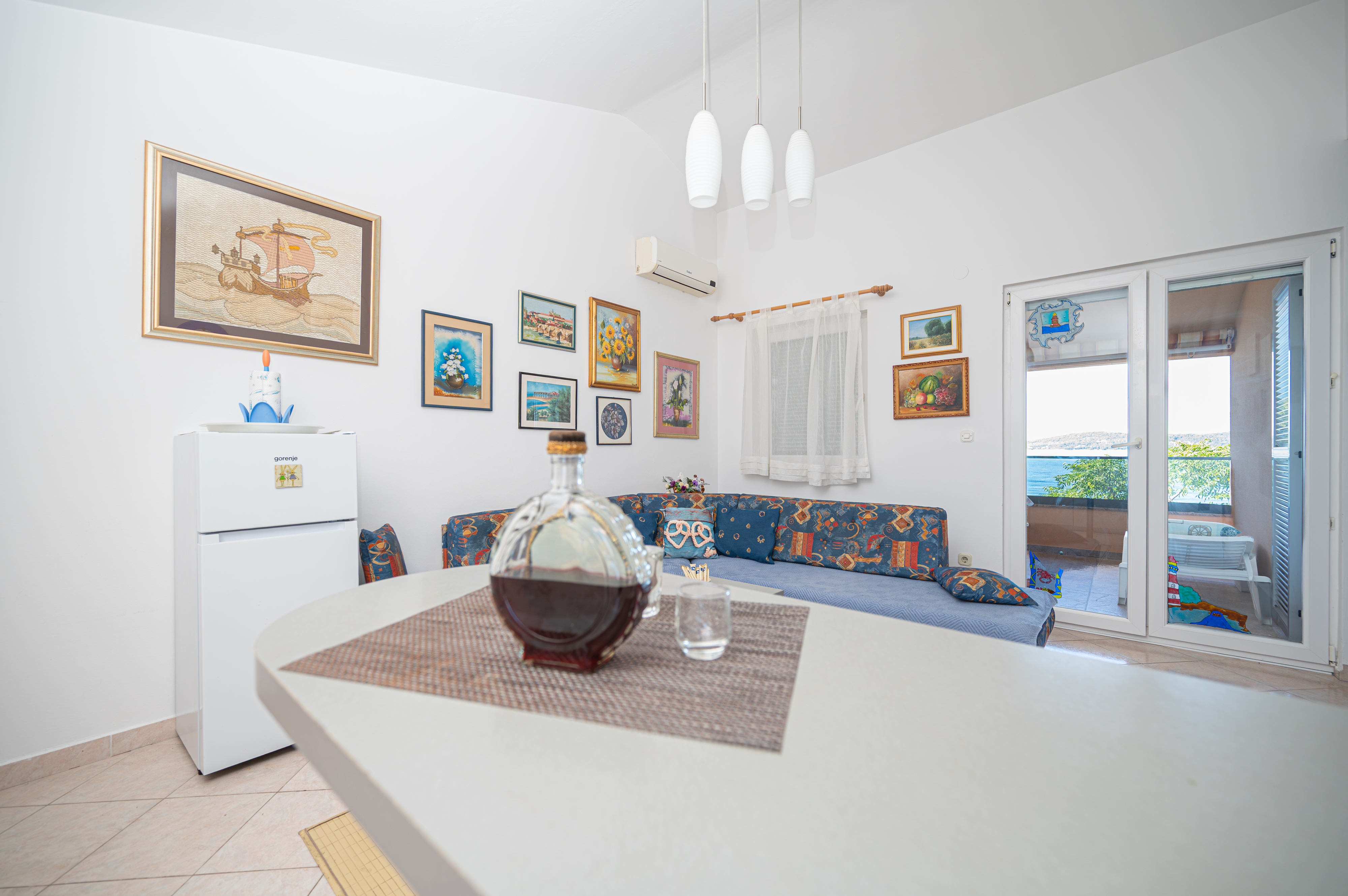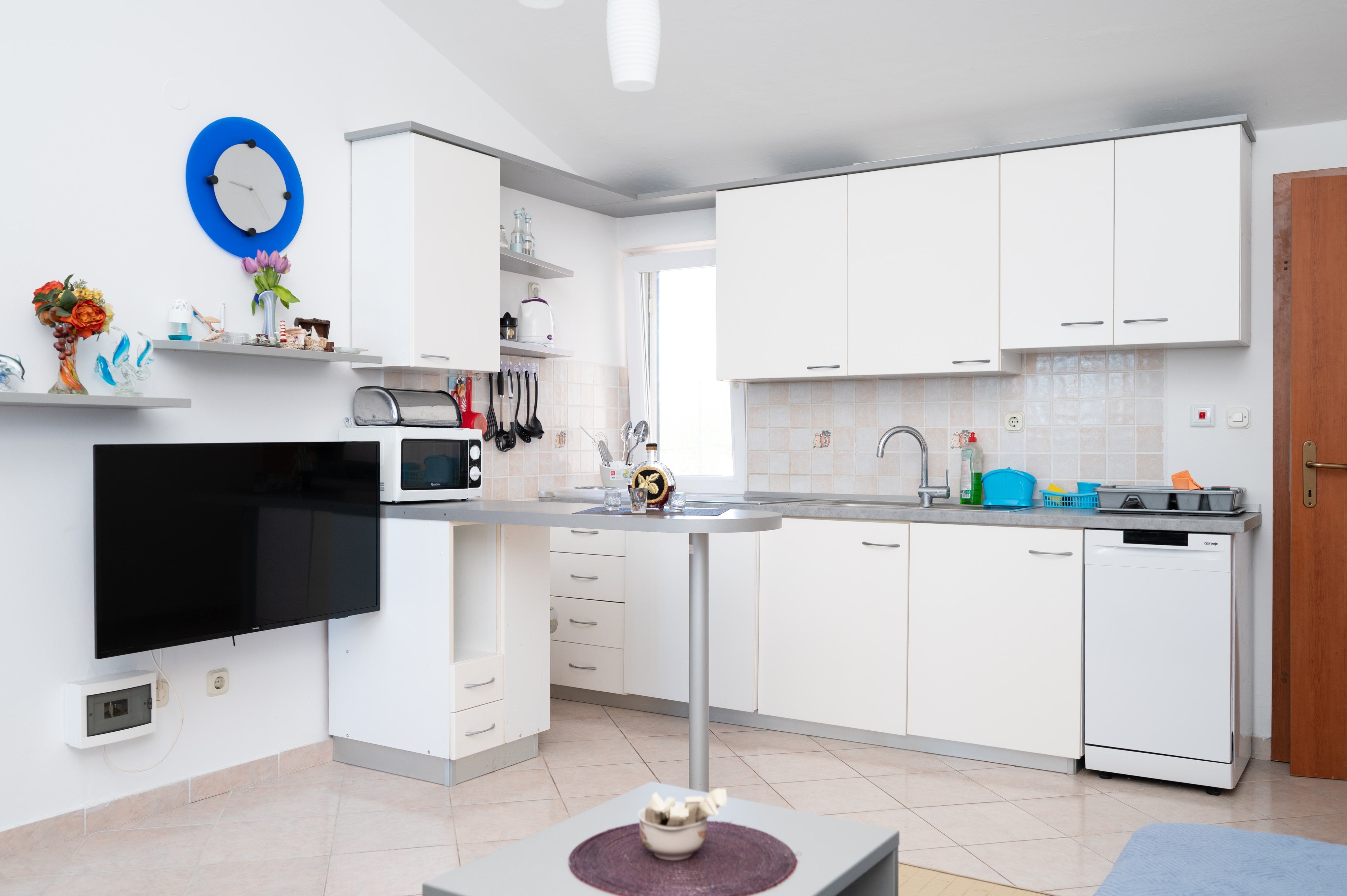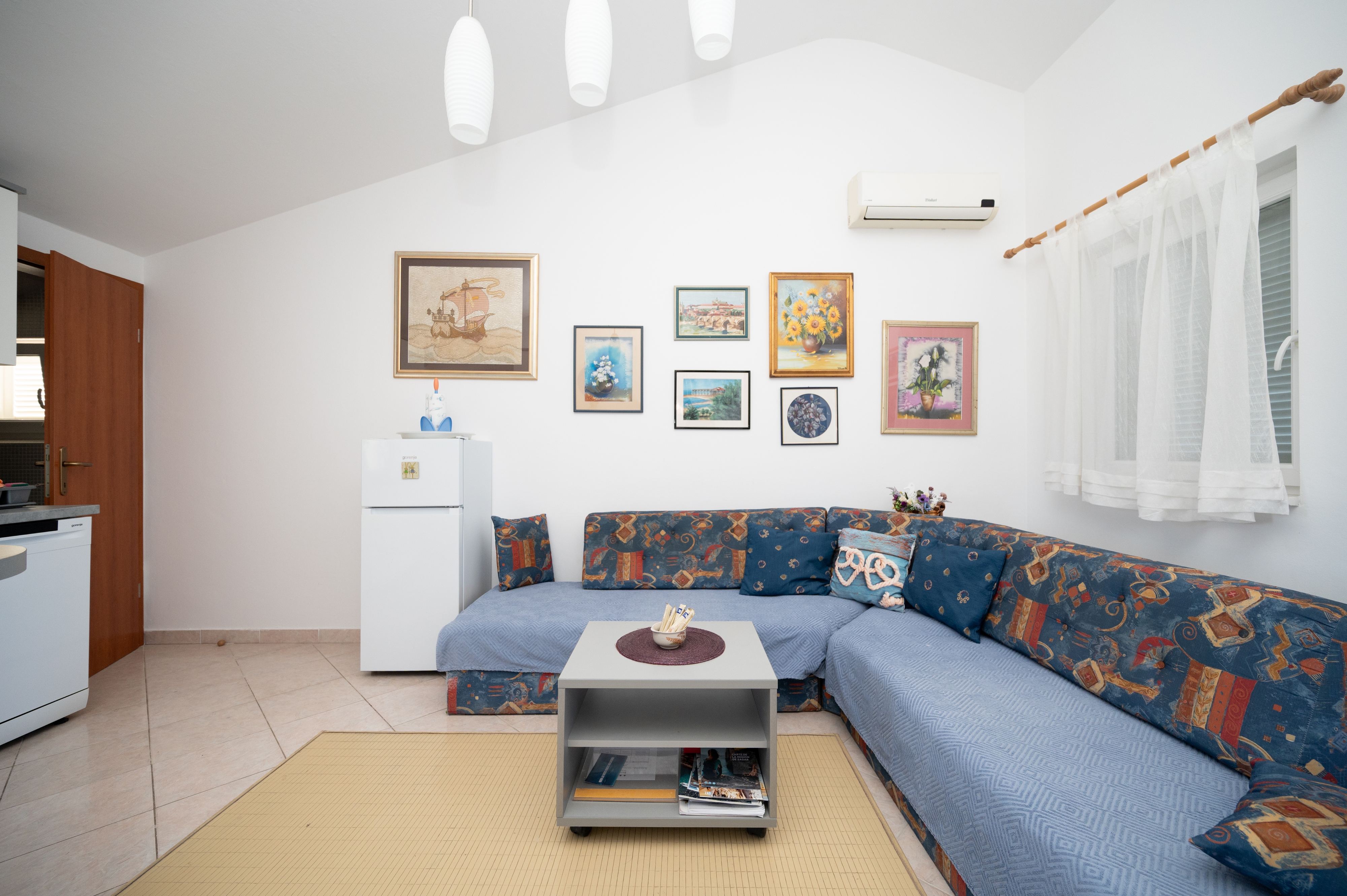 Apartment can accommodate 5 guests. Beds are situated in 2 sleeping rooms, but also in the living room, within 43m2. Guests can use a private terrace to enjoy the warm summer evenings. The apartment offers the sea view. Food can be prepared using barbecue which is shared with other guests too. INCLUDED IN THE PRICE: tourist tax, final cleaning, parking, internet, baby cot, iron, ironing board, hairdryer, sunshade, sunchairs. OPTIONAL ADDITIONAL COSTS: air-conditioning (€6.00 per night). The availability of additional services for your chosen dates of stay, as well as their prices (if none are listed) must be checked ahead of time. Any additional services not shown in the price calculation are payable directly to the property owner and only if used by the visitor.